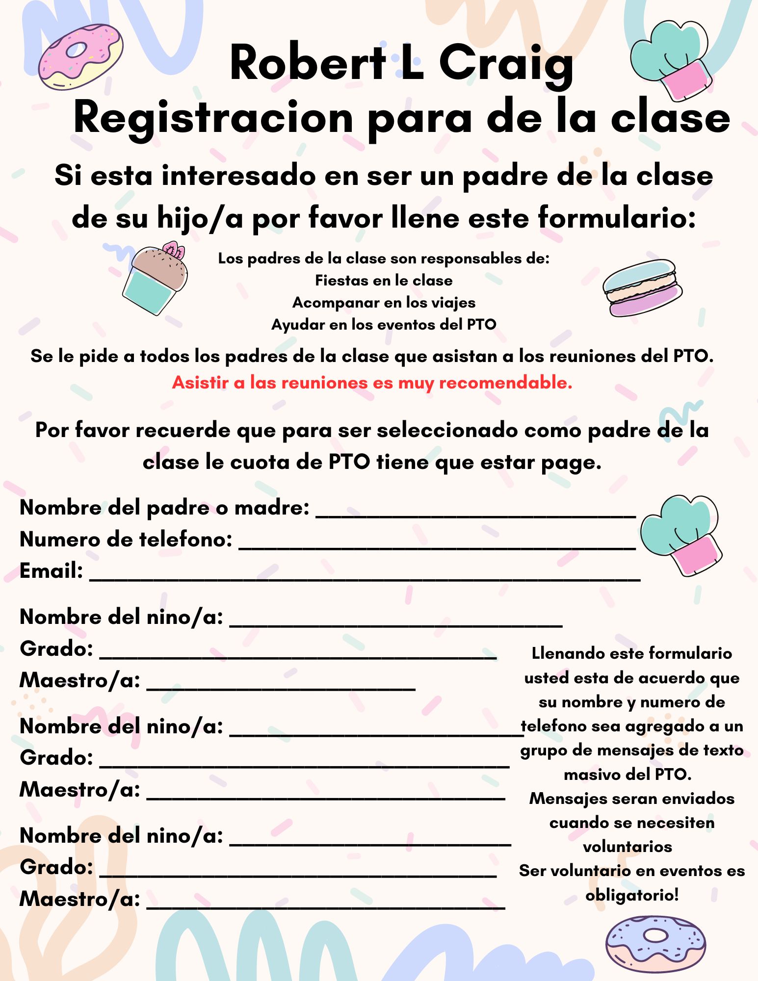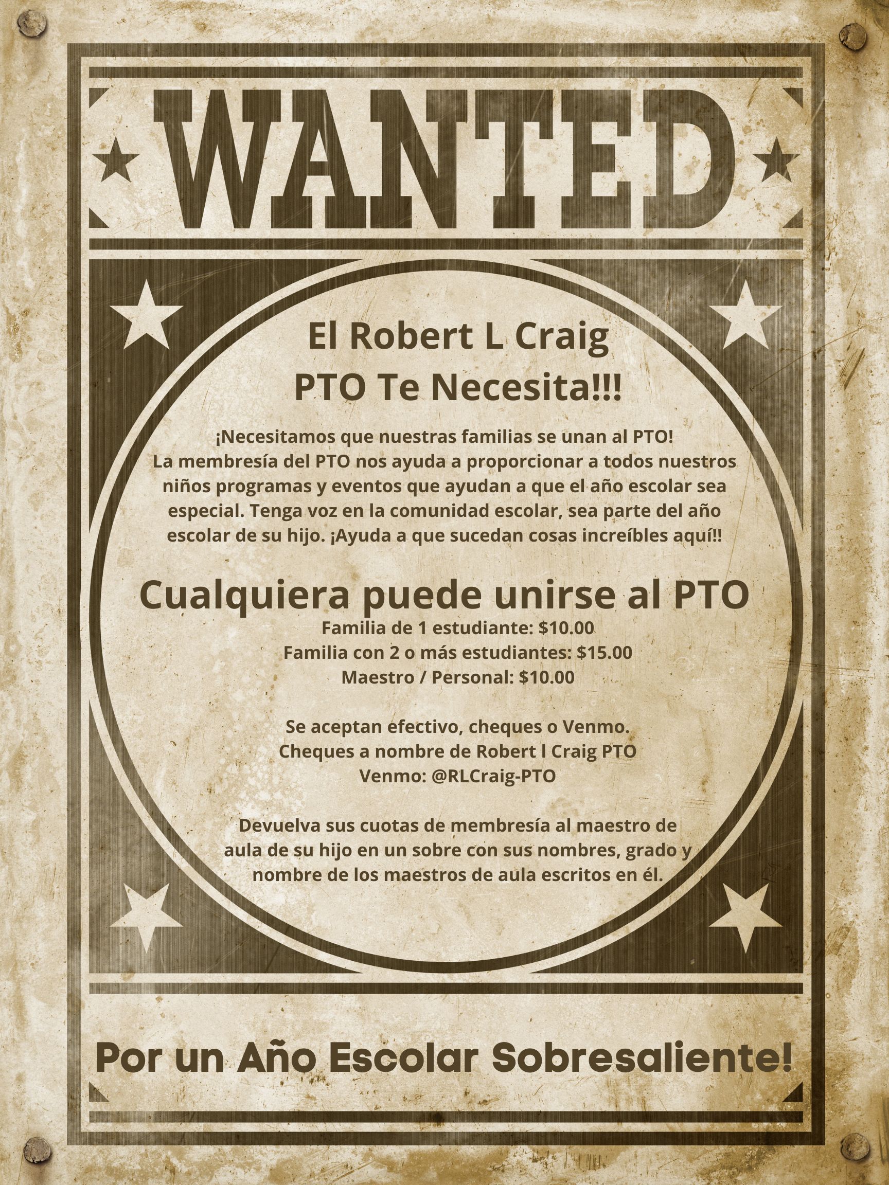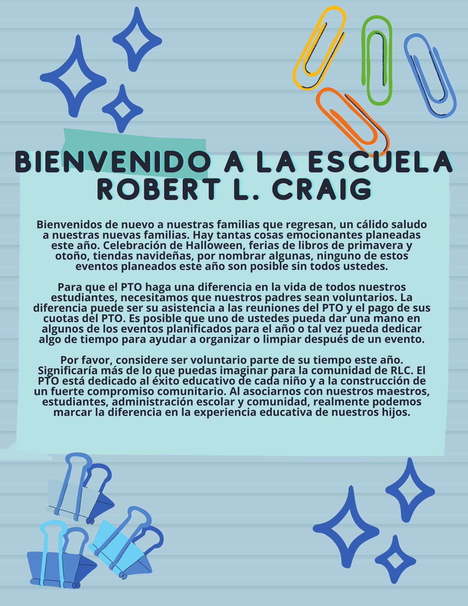 Our first PTO meeting in the cafeteria will be on Wednesday, September 21st at 7PM. Nuestra primera reunión del PTO en la cafetería será el miércoles 21 de septiembre a las 7 PM.